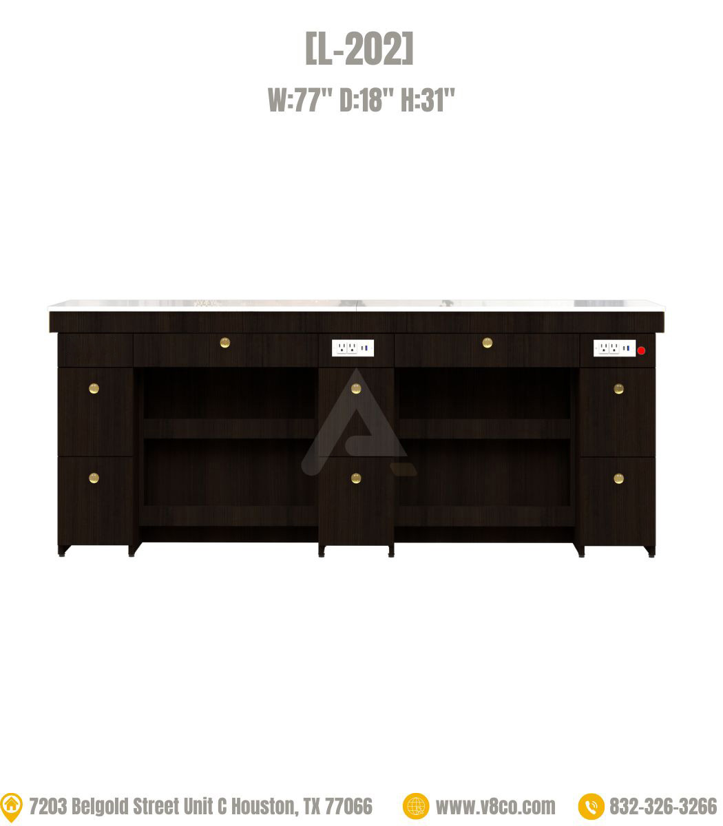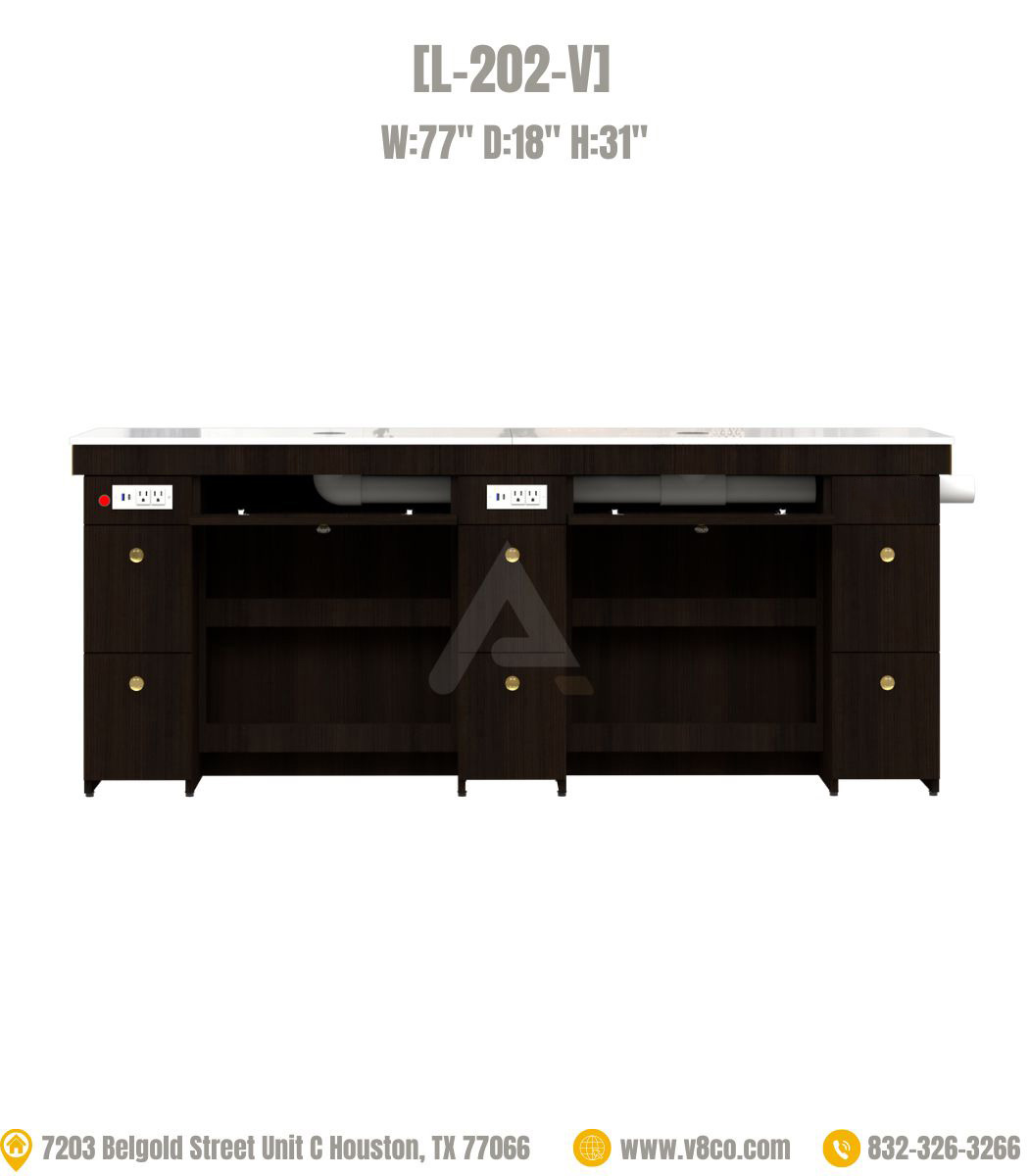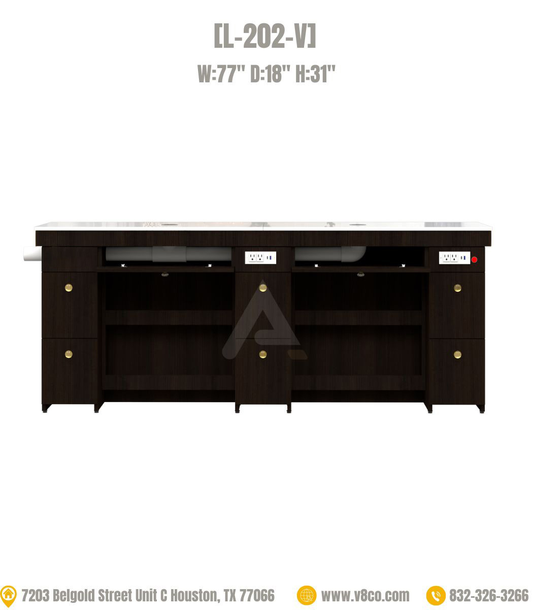 The modern dark mahogany and gold accents make the perfect statement pieces for your salon. Nail desk has quality MDF (Medium-Density Fiberboard) sturdy design made to last. Manicure table with drawers featuring stylish texture panel in the middle with elegant marble top bring a touch of glamour into your space.