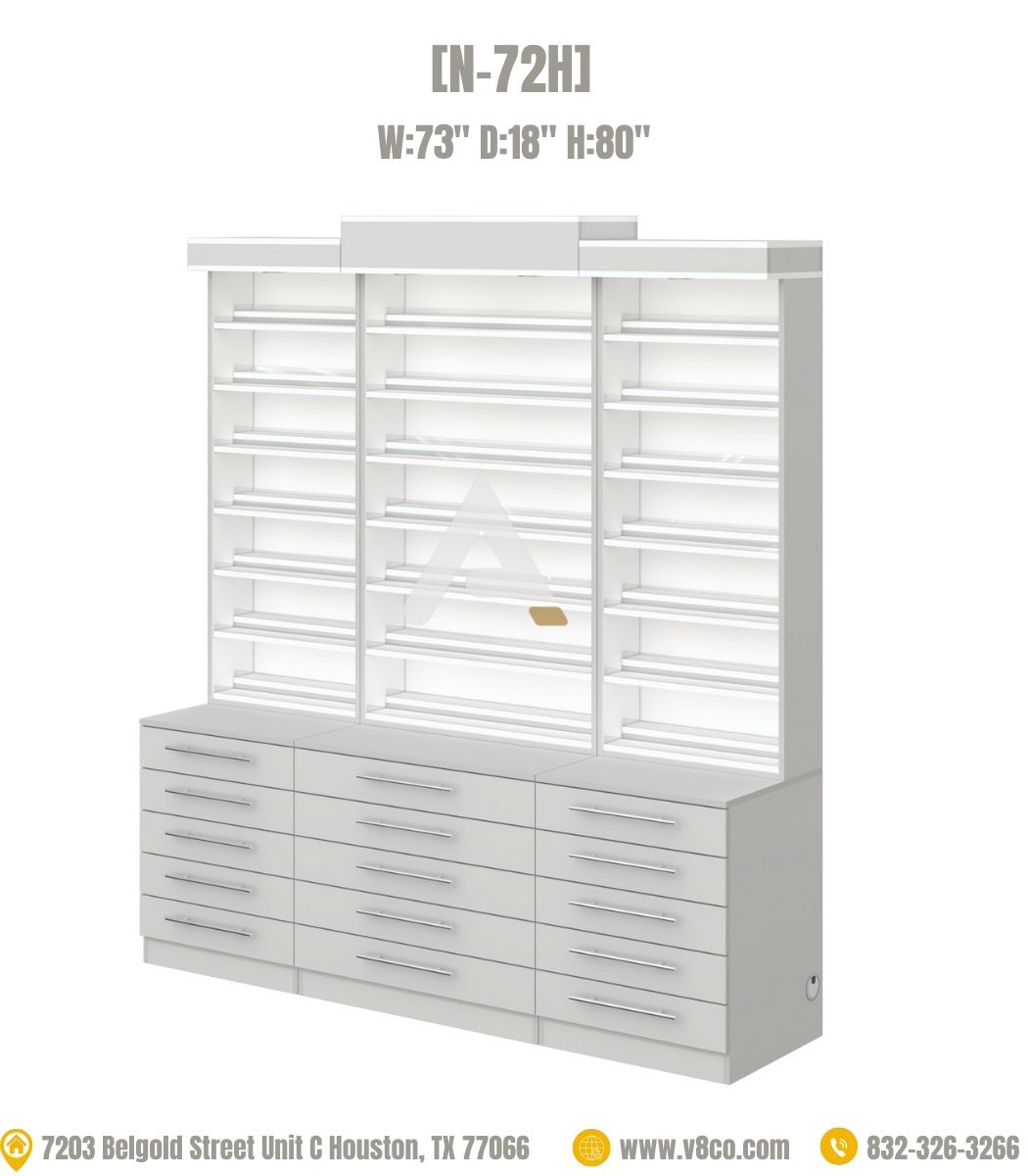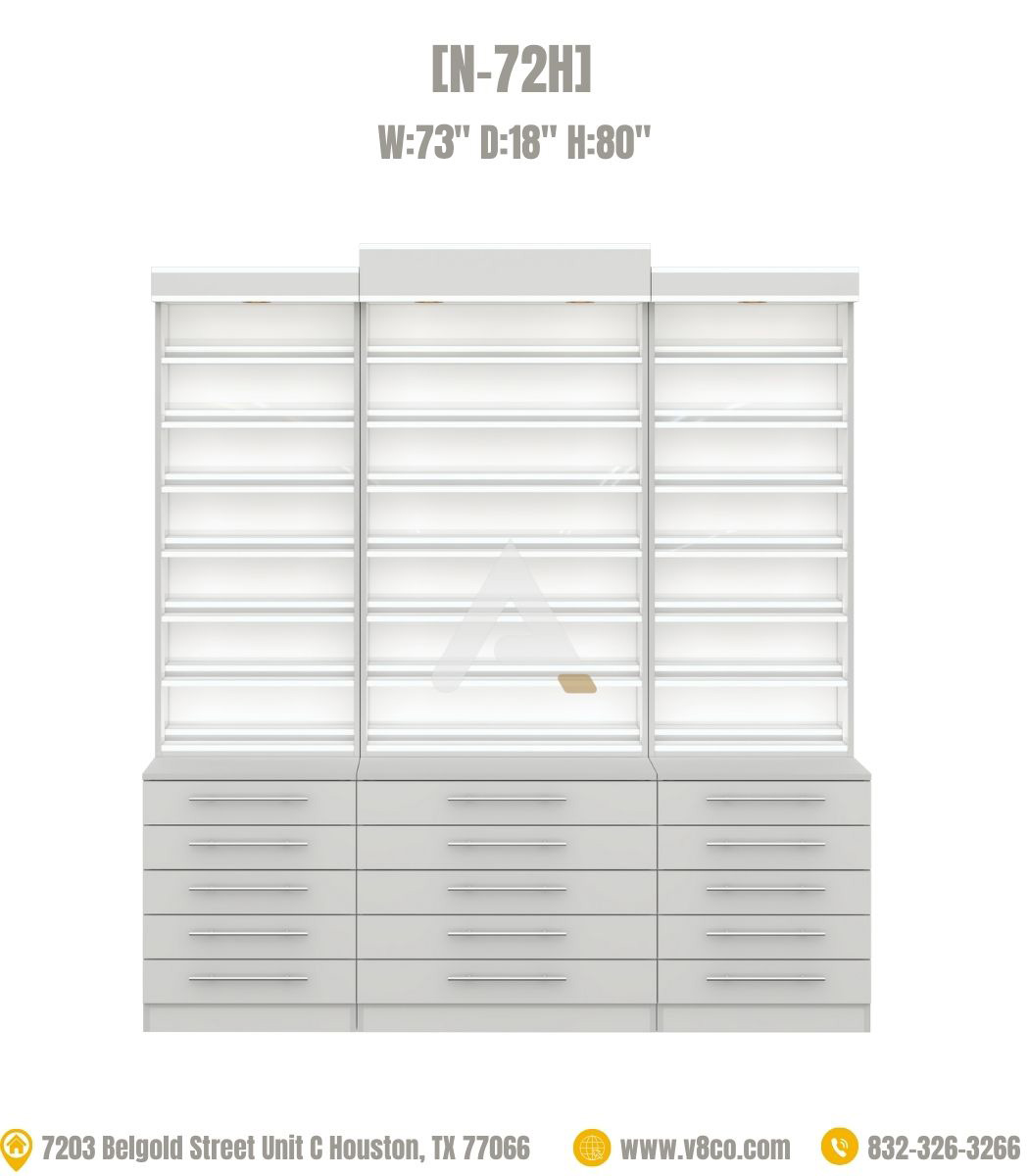 The nail polish cabinet with brilliant white LED lighting built-in top of the shelve which can brilliantly your lacquer/dip powder on the shelves. Extra storage of powder or polish in the drawers.