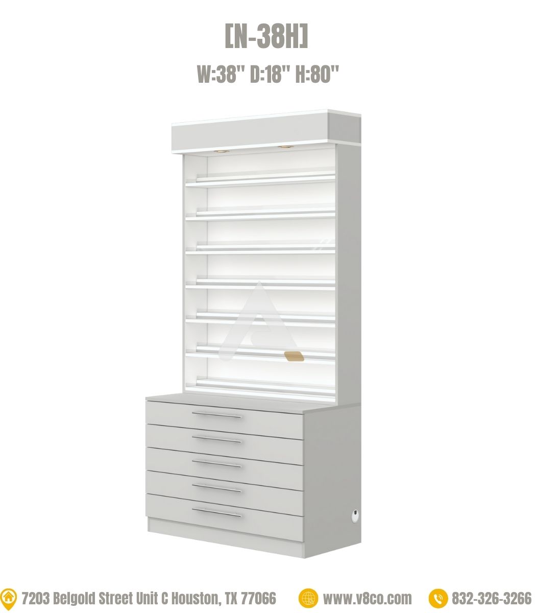 The nail polish cabinet with brilliant white LED lighting built-in top of the shelve which can brilliantly your lacquer/dip powder on the shelves. Extra storage of powder or polish in the drawers.