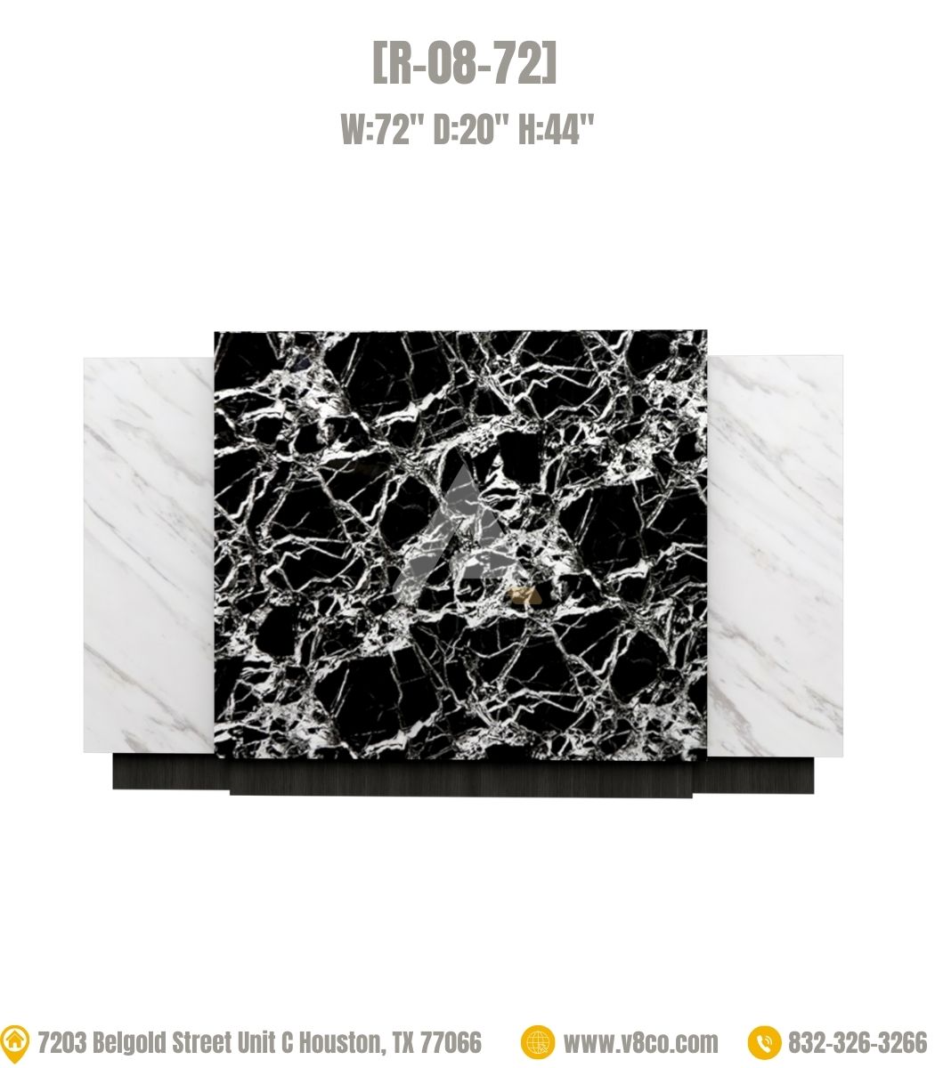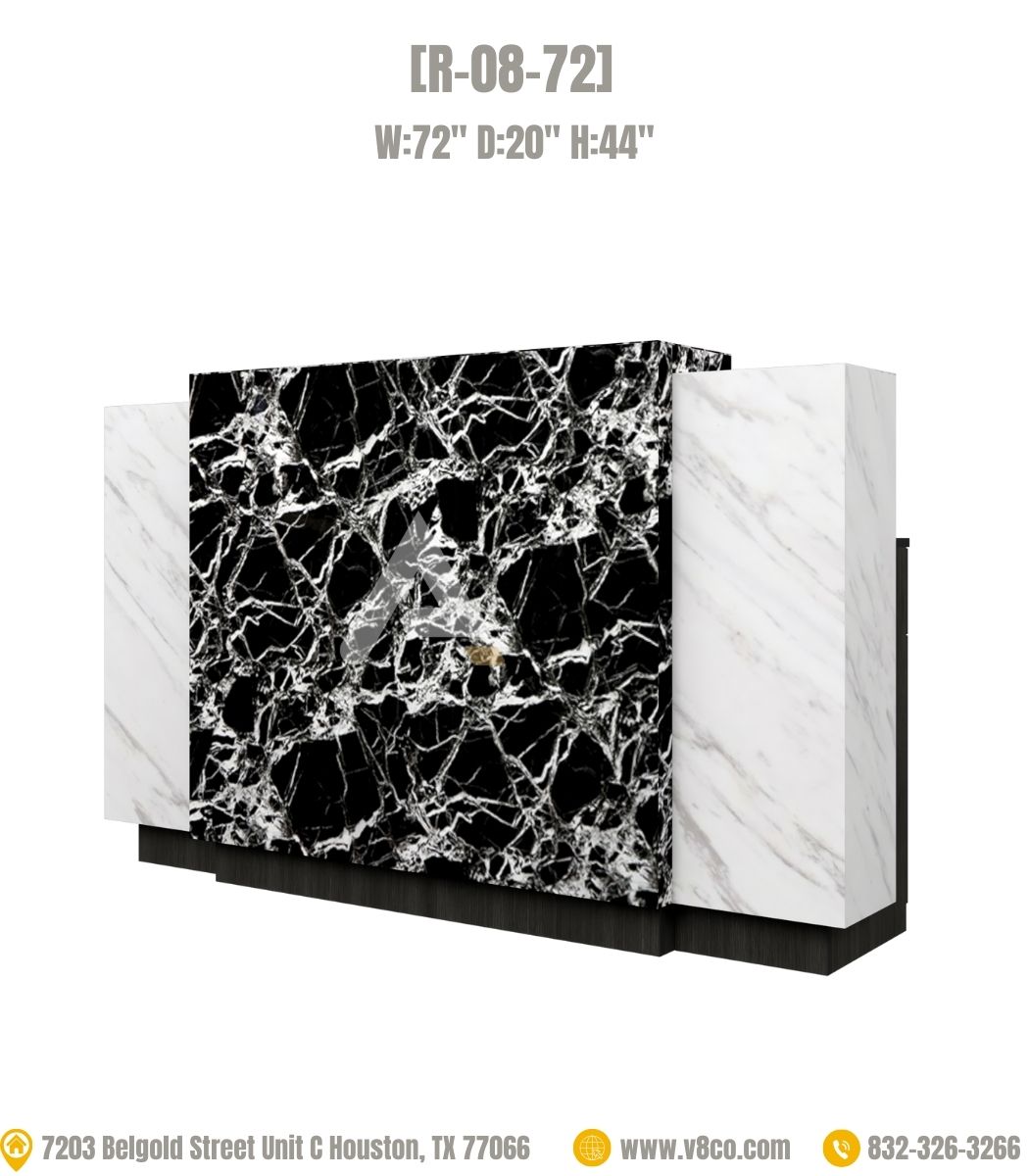 This reception features a unique design that injects a distinctive landscape into the salon.  With the front of the reception is a combination of white and black marble-patterned PVC, the surface is glossy and easy to clean.