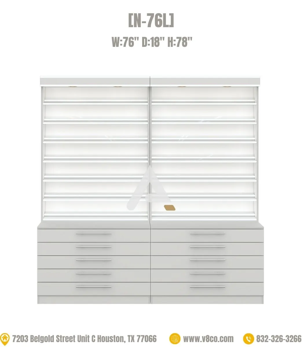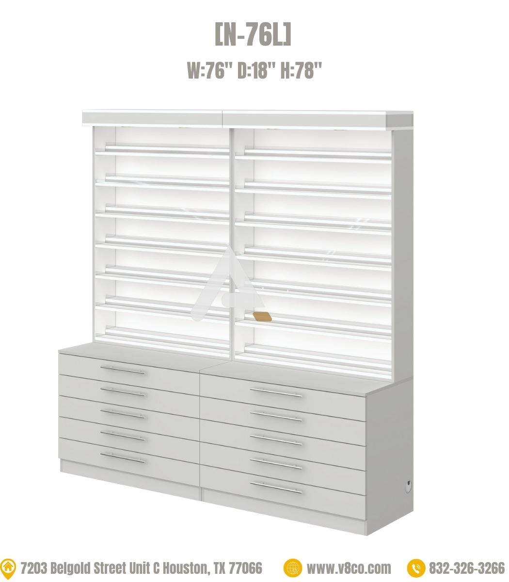 The nail polish cabinet with brilliant white LED lighting built-in top of the shelve which can brilliantly your lacquer/dip powder on the shelves. Extra storage of powder or polish in the drawers.