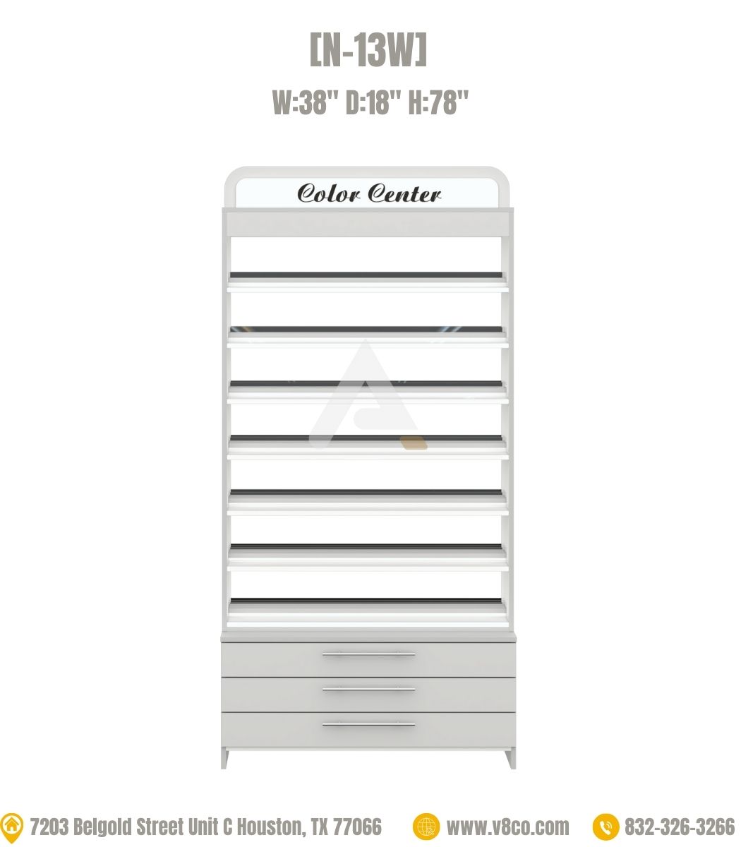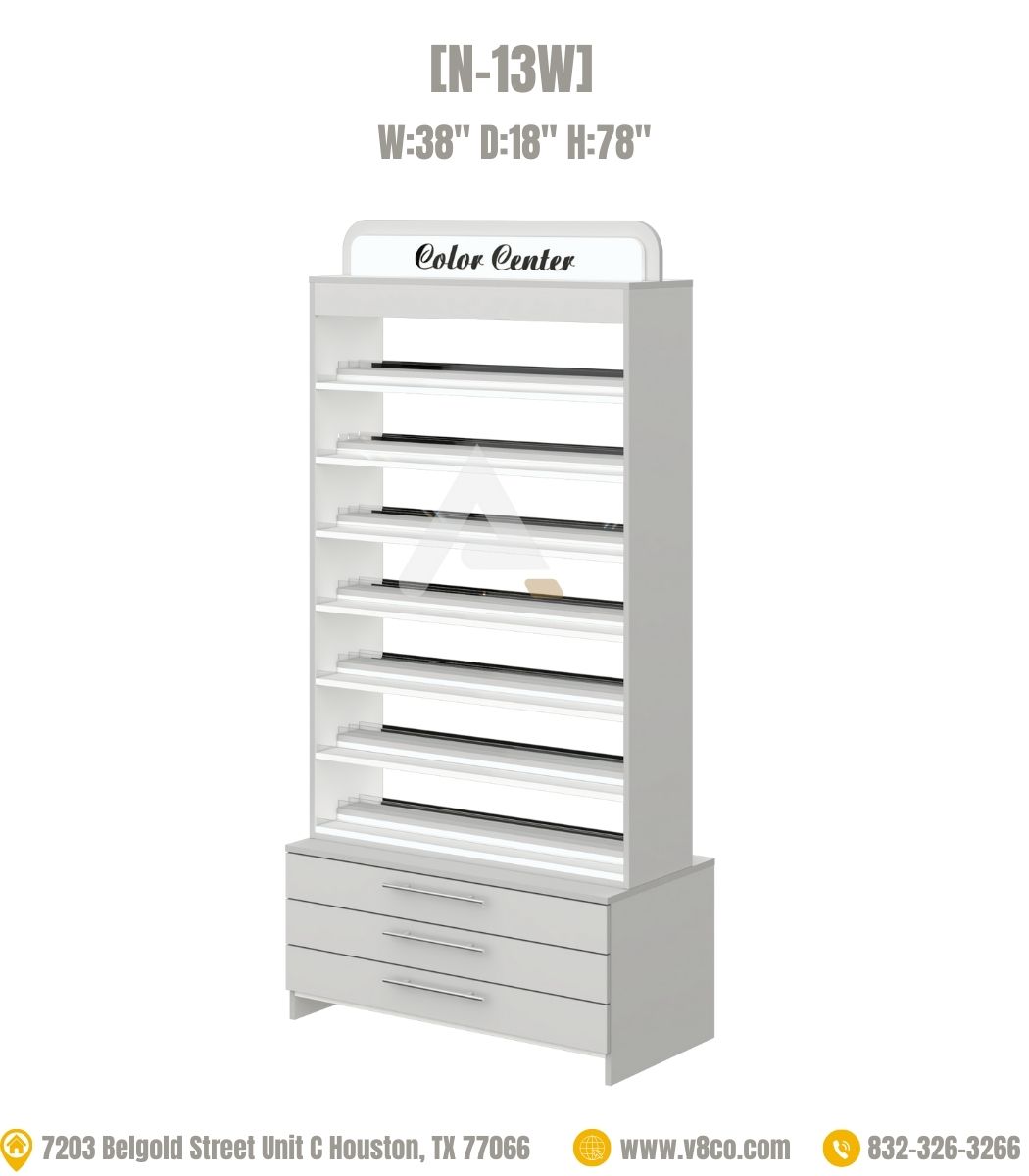 The nail polish cabinet with Color Center header. Extra storage of powder or polish in the drawers.