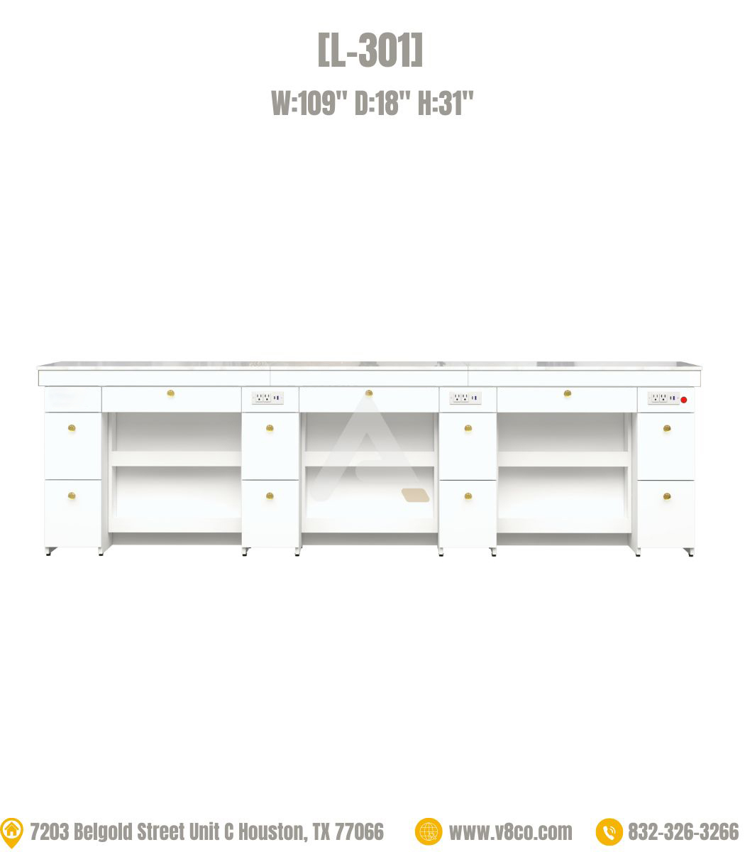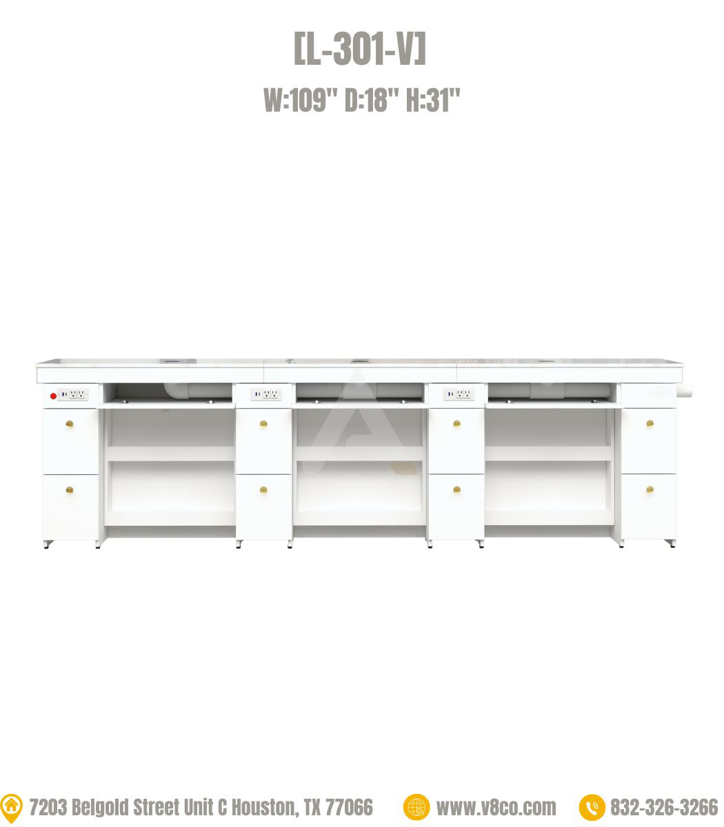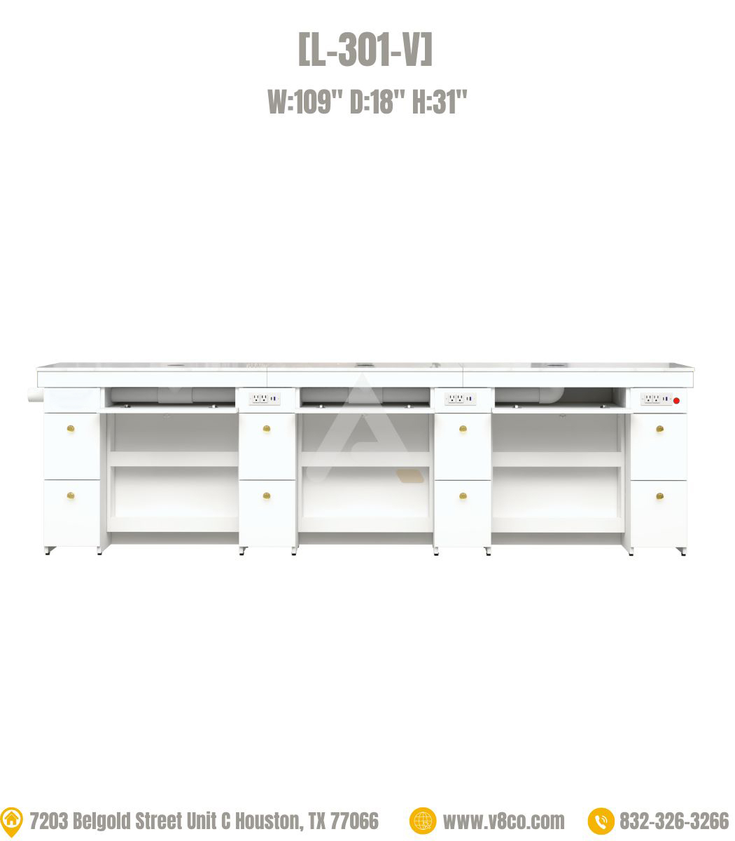 - The nail table multiple drawers that offer a plenty of space for all the essential tools and products while giving you easy access to provide an efficient and speedy service. Extra storage compartment in the middle panel to fulfill your storage needs. Come with trash bin and wheels.